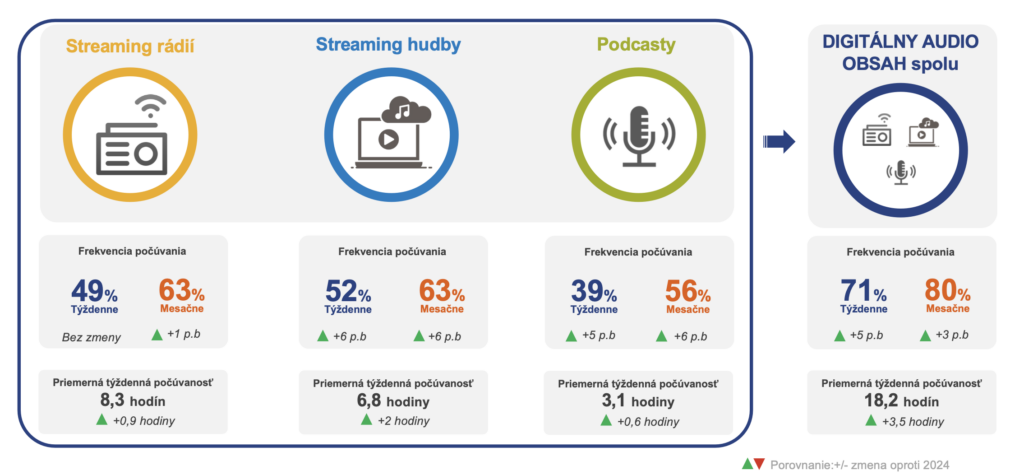 Výraznejší posun nastal pri týždennej konzumácii digitálneho audio obsahu. Počet poslucháčov digitálnych rádií, streamovacích služieb a podcastov sa oproti roku 2024 zvýšil o 6 % percentuálnych bodov na 2,6 milióna. Títo poslucháči konzumujú audio obsah aspoň raz týždenne.