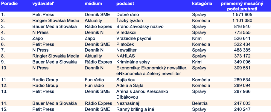 Prvá pätnástka podcastov podľa priemerného mesačného počtu prehratí za 07/2024 – 06/2025: