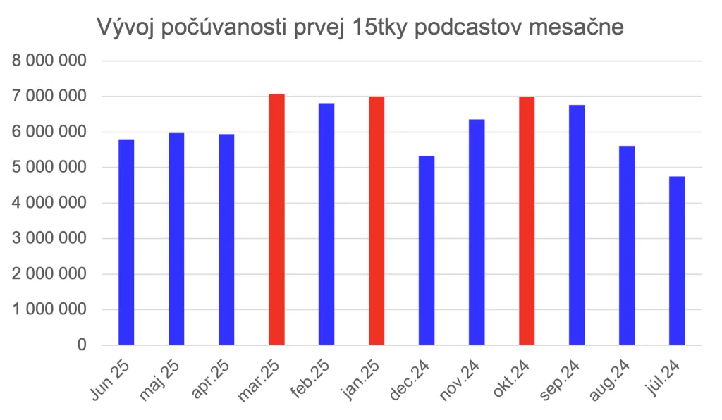 Prvá pätnástka podcastov podľa priemerného mesačného počtu prehratí za 07/2024 – 06/2025: