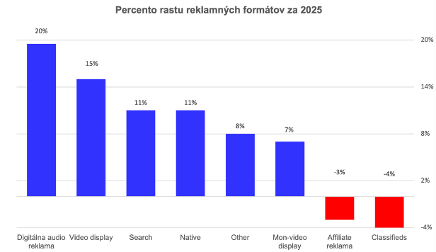 Tento výsledok bol do značnej miery spôsobený poklesom príjmov v prvom polroku 2025 (-4%). Výdavky v druhom polroku síce rástli o 2%, ale tento slabý rast nedokázal dohnať stratu v prvom polroku. V druhom polroku zaznamenali rast tri reklamné formáty a to: non-video display, natívna reklama a audio digitálna reklama.