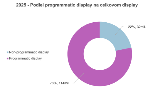 V roku 2025 mierne oslabil aj rast programatickej reklamy, skončil s 11% rastom, čiže o 2% body menej ako v roku 2024. Od roku 2021 sa do programatickej reklamy započítava všetka reklama, ktorá sa nakupuje automatizovaným spôsobom. Čiže zahŕňa investície zrealizované cez DSP platformy, cez reklamné nástroje Google Ads, DV360 a Facebook Ads.
