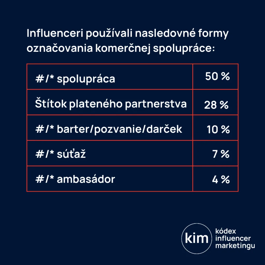Slovenskí tvorcovia najčastejšie používajú hashtag #spolupraca (alebo variant *spolupráca). Táto forma označenia sa objavila v 50 % zo všetkých označených príspevkov.